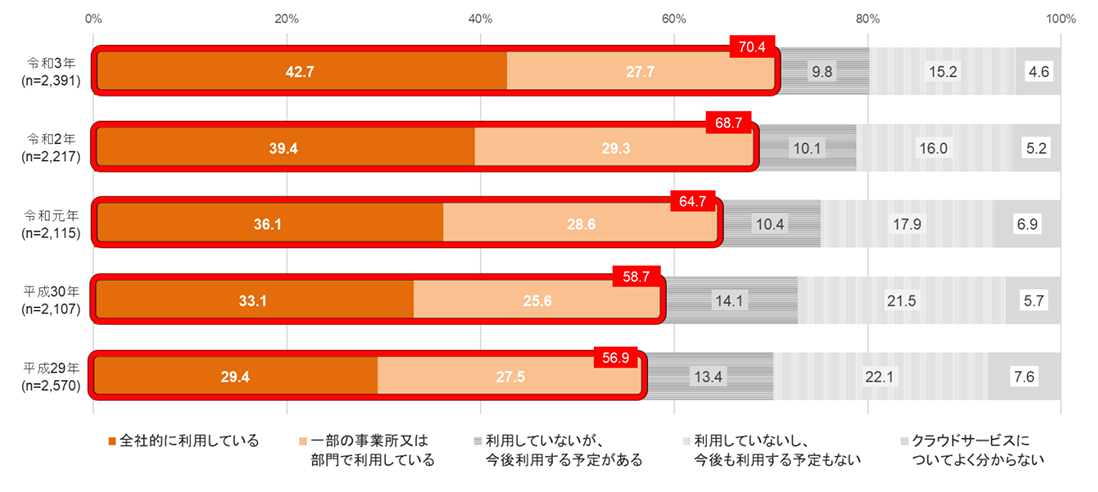 総務省の令和3年通信利用動向調査によれば、過去5年間一貫して増加してきたクラウドサービスを利用する企業の割合が、調査開始以来はじめて7割を超えた(「全社的に利用している(42.7%)」と「一部の事業所又は部門で利用している(27.7%)」の合計)。「利用していないが、今後利用する予定がある」企業が9.8%なので、拡大基調は今後もしばらく続きそうだ。