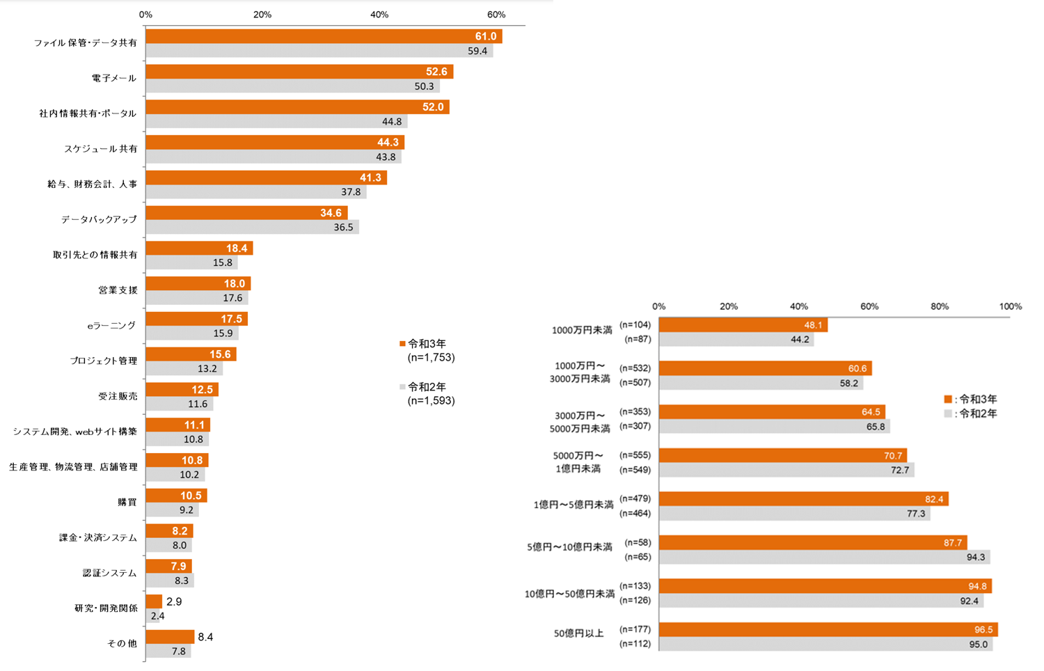 クラウドサービス利用の用途(左)/ 資本金規模別クラウドサービスの利用状況(右)